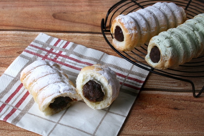あんペーストをサクサクのパイに詰め込んで。小倉あんは、食感と風味を生かすため粉糖で仕上げて優しい味わいに。こしあんは、上品な甘みが一層引き立つように抹茶で仕上げています。