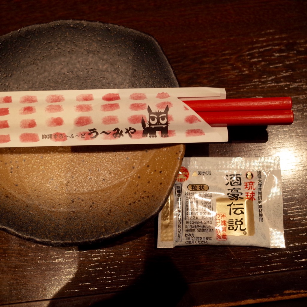 席につくと可愛いシーサーの絵が書かれた箸袋、そして琉球酒豪伝説と書かれた小さな袋が置いてありました。